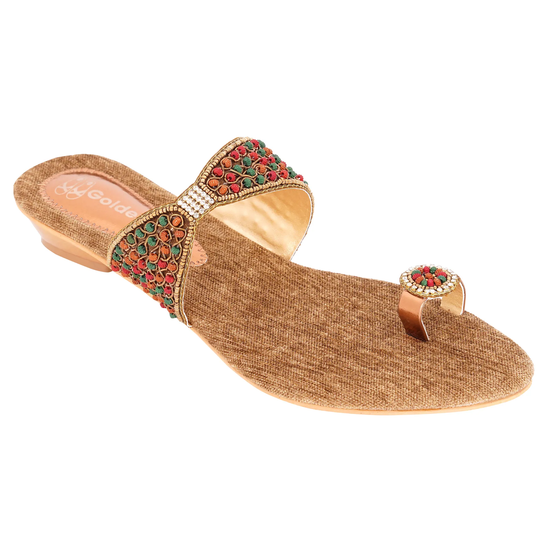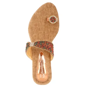 Step into a world of comfort, support, and style with these beautifully handcrafted toe-ring sandals from “Golden Tag.” Designed with a unique blend of traditional craftsmanship and modern comfort features, these sandals are perfect for adding a touch of elegance to your everyday look or special occasions. Key Features: Textured Beige Material: The upper strap and sole are crafted from a textured beige material, adding a touch of natural elegance. Intricate Floral Beadwork and Zari Accents: The upper strap and toe ring are adorned with colorful beads arranged in floral patterns, along with delicate zari work, showcasing meticulous craftsmanship. Saro Sheet Sole: The durable and stable saro sheet sole provides excellent support and longevity. 1-Inch Heel for Support and Stability: The 1-inch heel is designed to provide better support and stability, enhancing comfort with every step. 4mm EVA Insole: Enjoy all-day comfort with the 4mm high-quality EVA insole, providing superior cushioning and support. Precise Handcrafted Fit: Each pair is precisely handmade, ensuring a comfortable and snug fit. Toe-Ring Design: The classic toe-ring design adds a touch of traditional Indian style. Perfect For: Everyday wear, casual outings, festivals, and special occasions. Adding a touch of ethnic-inspired style to your wardrobe. Those seeking comfortable, supportive, and stylish handcrafted footwear. Step out in confidence and comfort with these handcrafted “Golden Tag” toe-ring sandals. Experience the perfect blend of support, durability, and elegance with every step you take. |