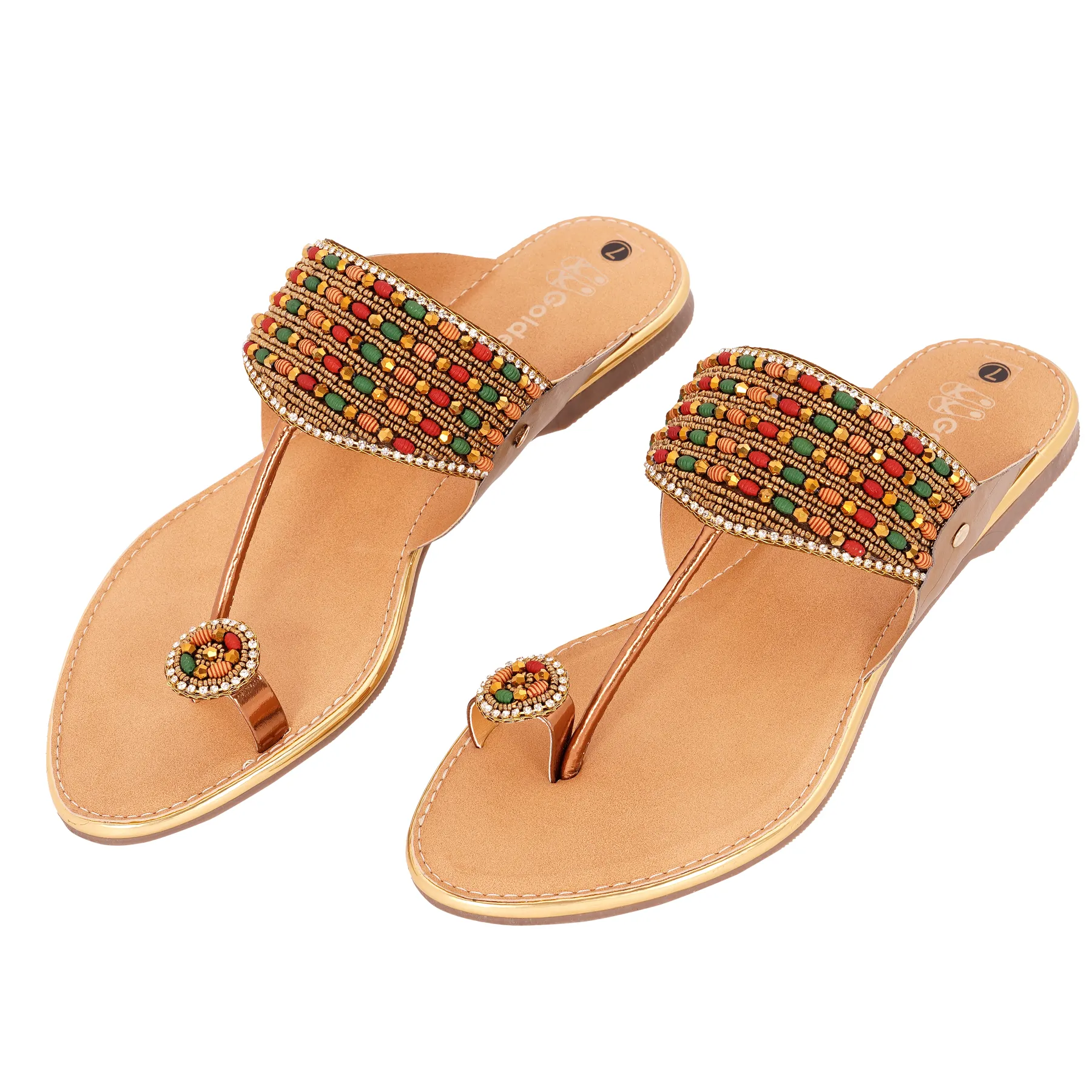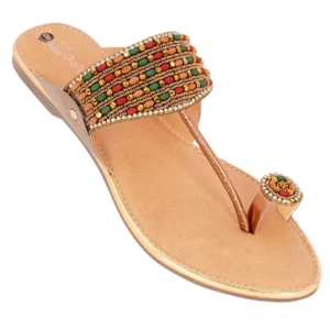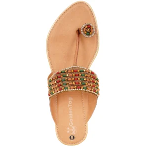Handcrafted Kolhapuri-inspired sandals with vibrant beadwork, zari accents, a durable TPR sole, and a 4mm EVA insole for all-day comfort. Perfect for adding an ethnic touch to any outfit.