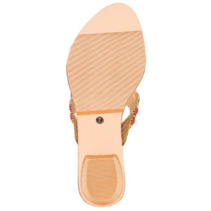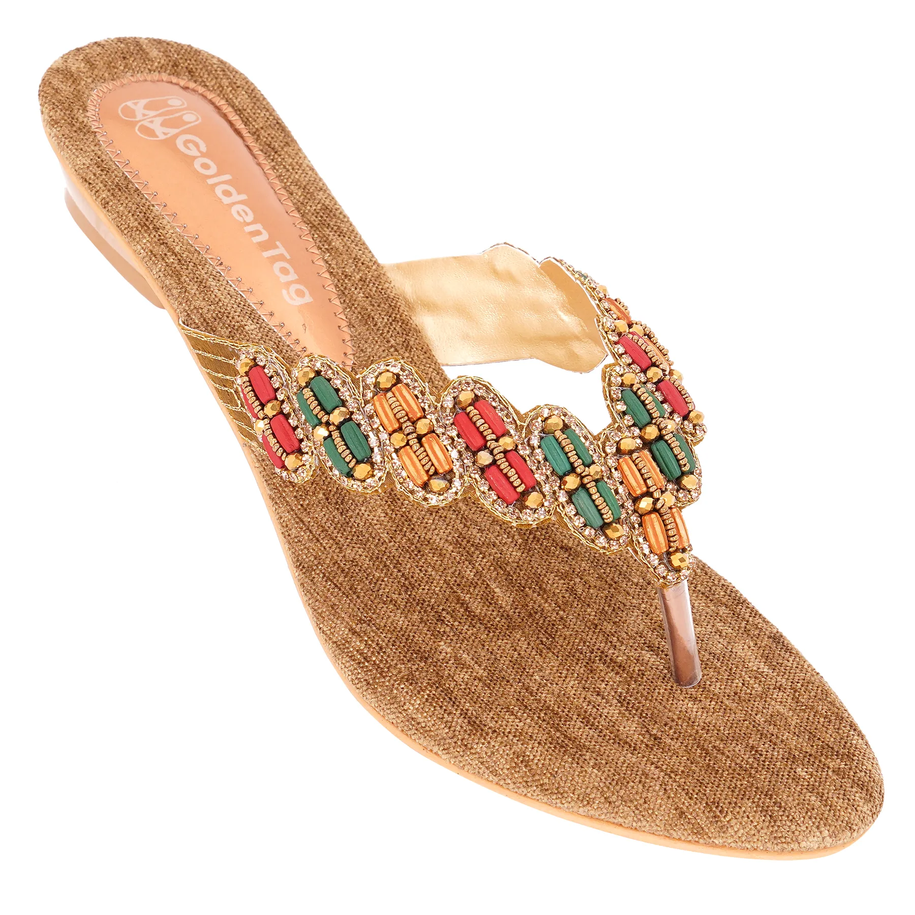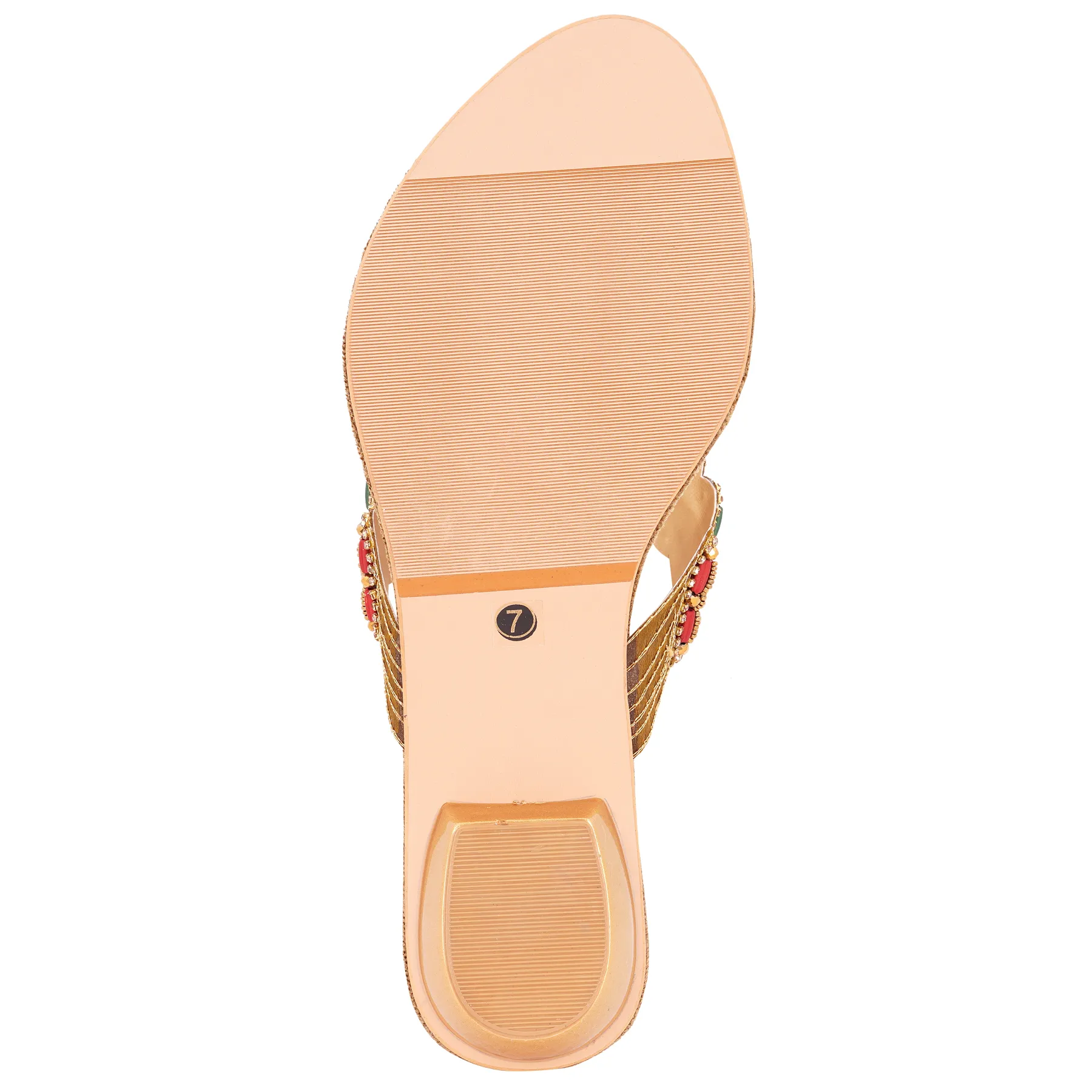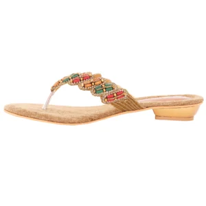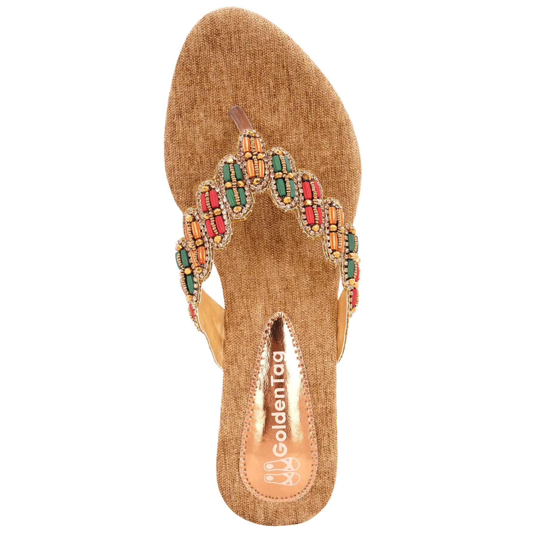 Handcrafted “Golden Tag” thong sandals with textured beige material, intricate beadwork, zari accents, a saro sheet sole,1-inch heel for support and stability , and a 5mm EVA insole for all-day comfort.