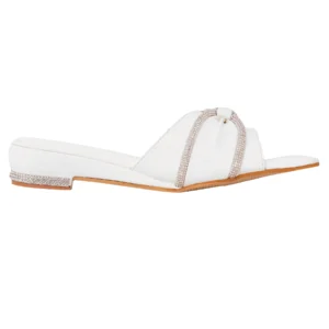 | Open-toe slide sandal in pristine white with elegant knotted straps trimmed in crystals. Features low block heel and crystal-embellished heel counter for fresh sophistication and bridal-worthy style. |