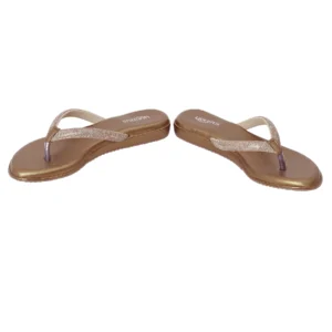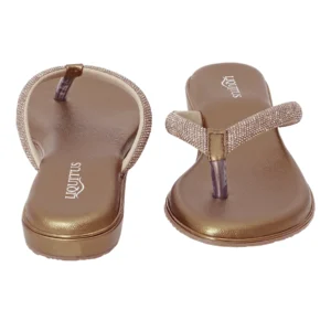 | Casual flat flip flop in shimmering champagne gold with fully crystal-encrusted straps. Features cushioned footbed and lightweight design for effortless glamour and everyday comfort |