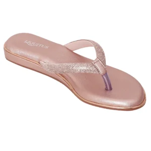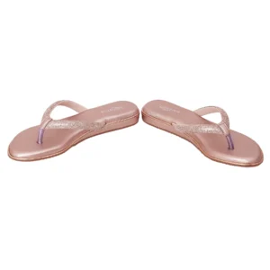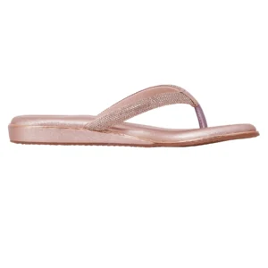 | Casual flat flip flop in luminous rose gold with fully crystal-encrusted straps. Features cushioned footbed and lightweight design for effortless glamour and everyday comfort. |