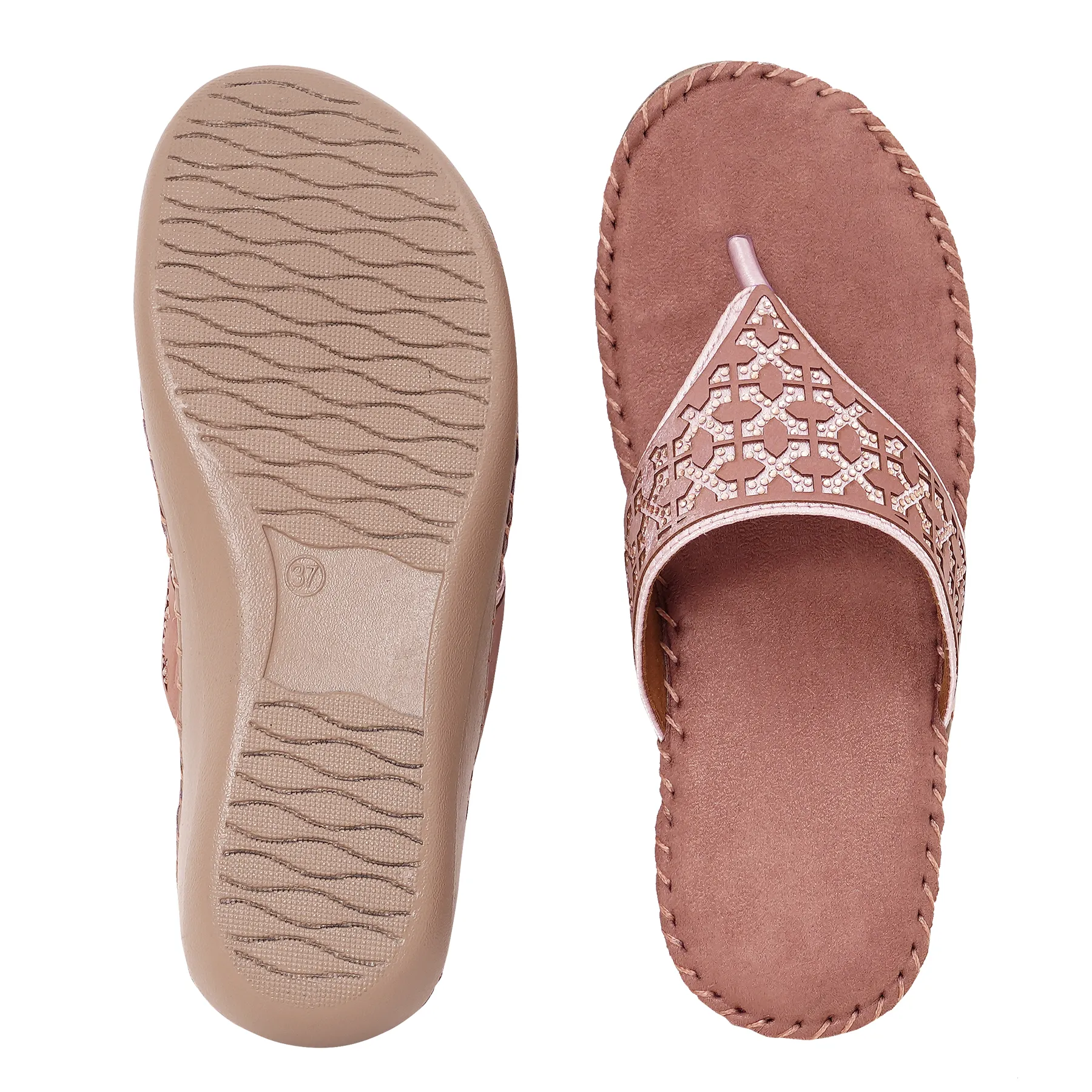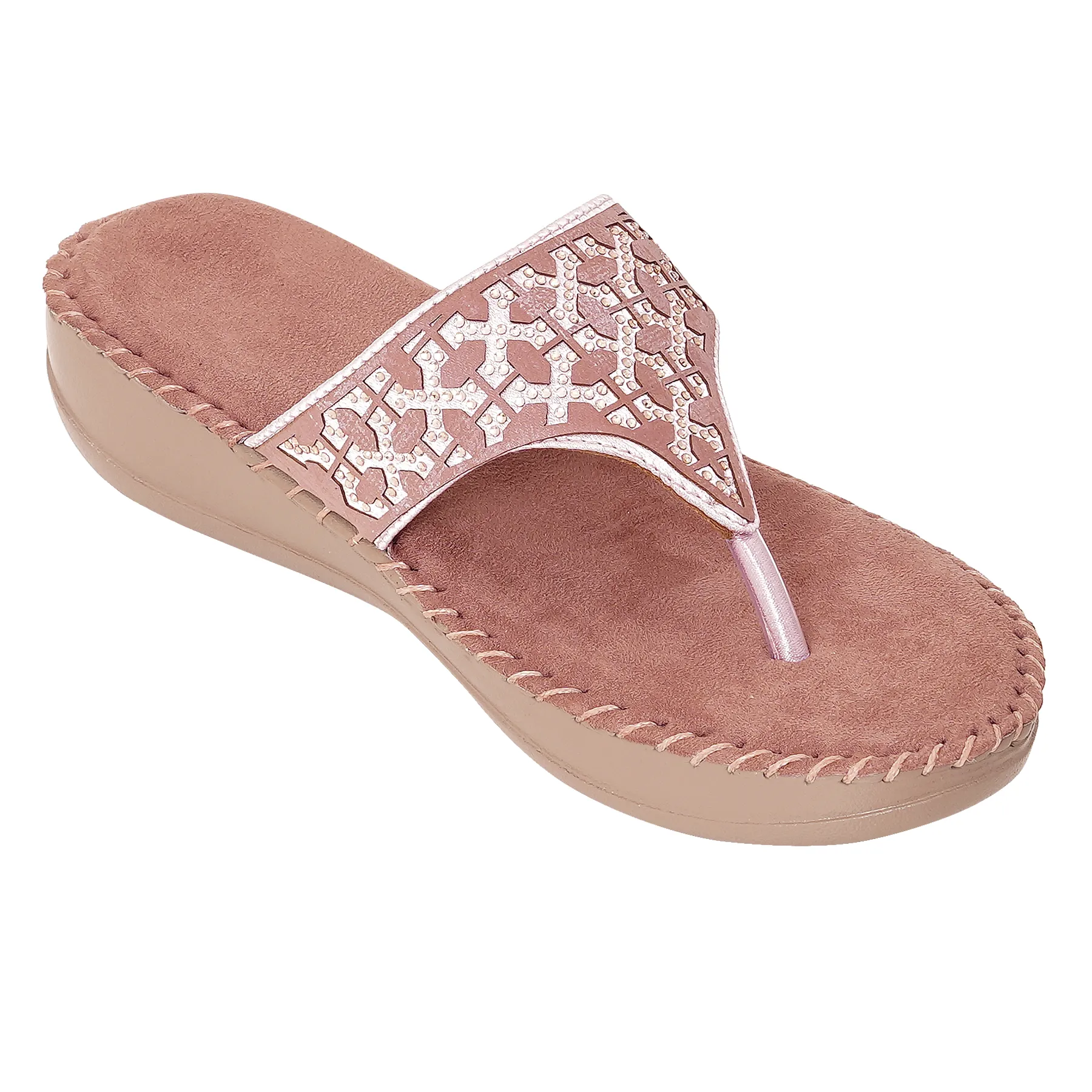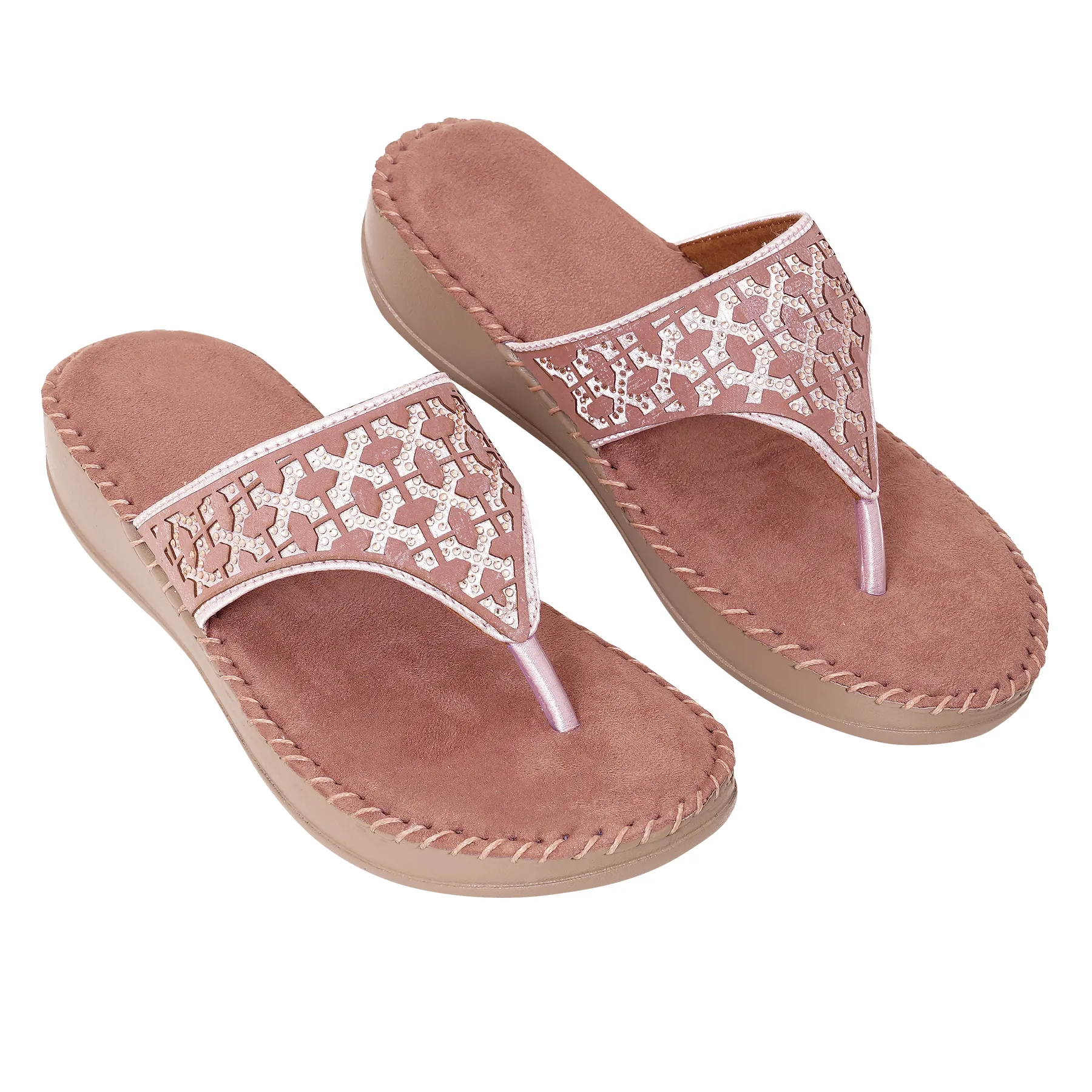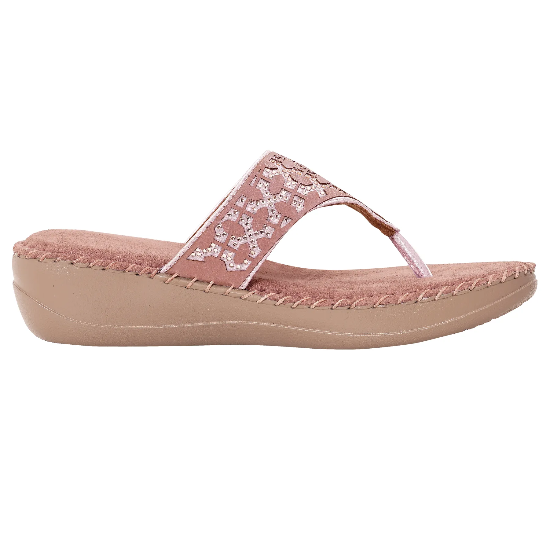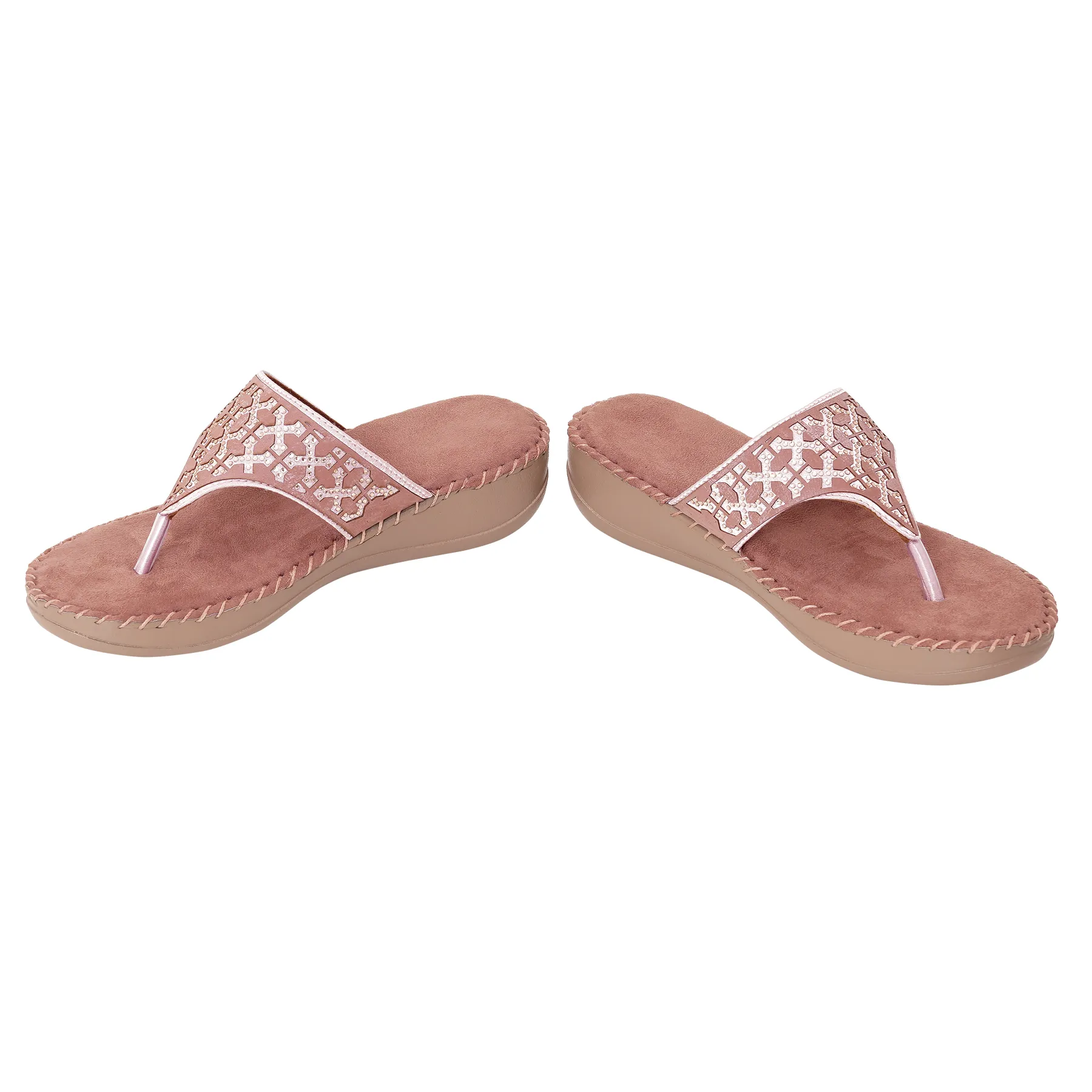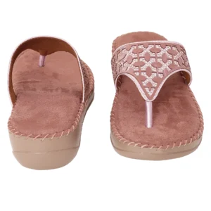| Orthopaedic wedge flip flop in soft rose pink with pearl lattice crystal pattern. Features plush velvet-touch footbed and ergonomic mid-sole for feminine elegance and therapeutic support |