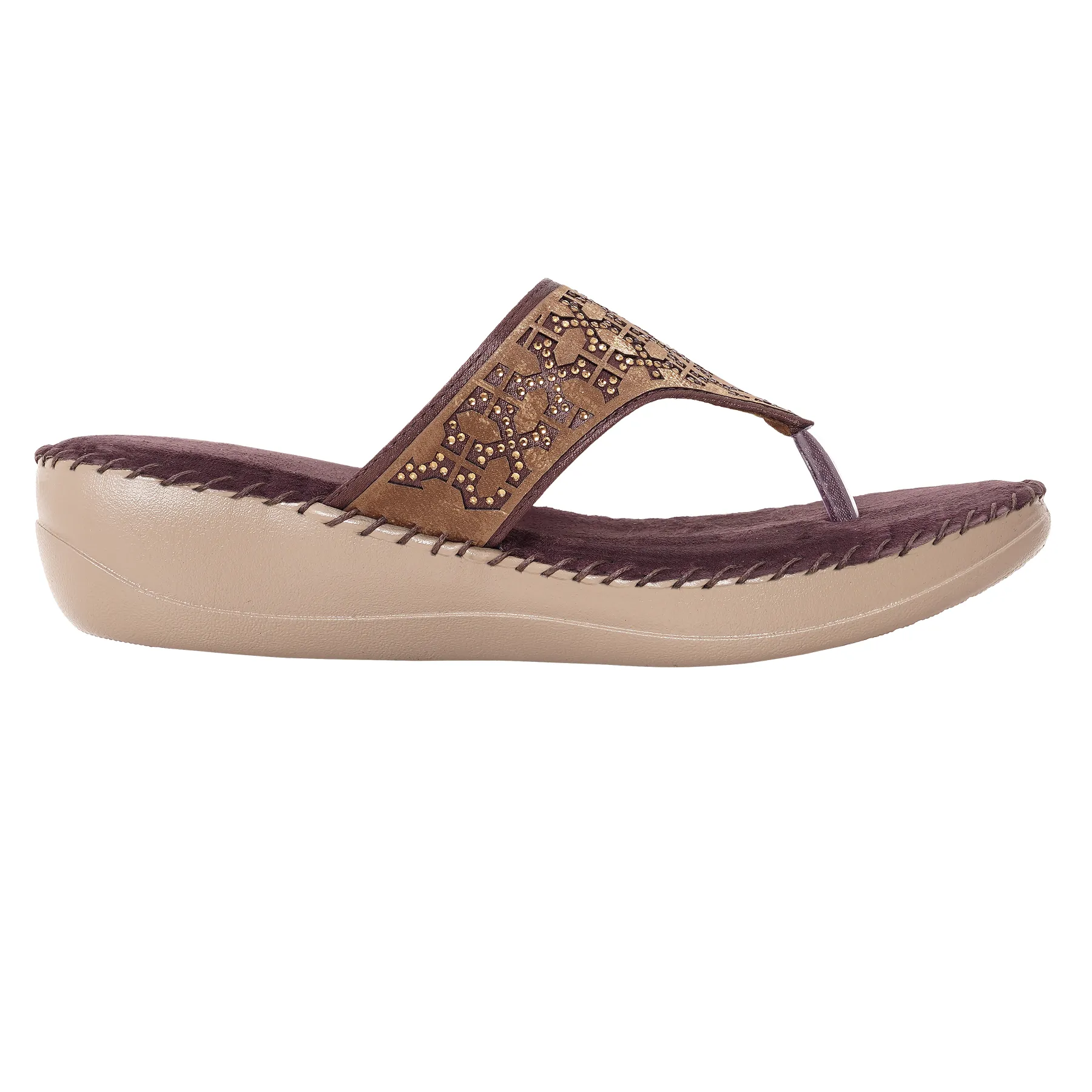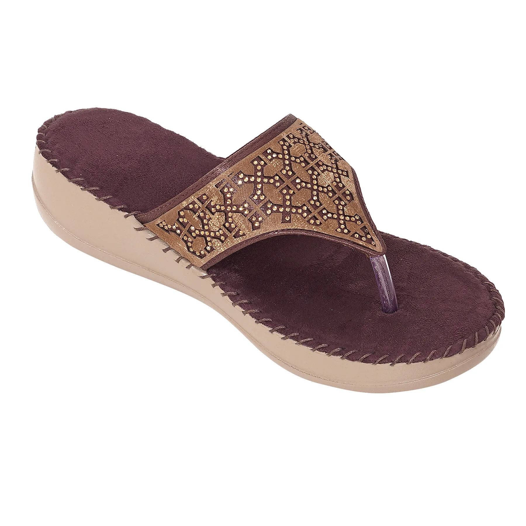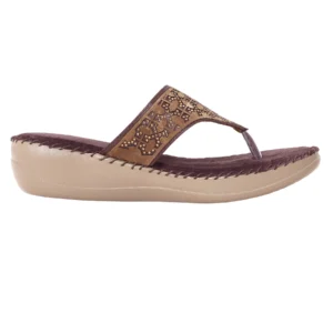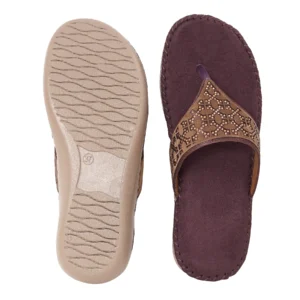 | Orthopaedic wedge flip flop in deep bruised burgundy with bronze floral crystal pattern. Features plush velvet-touch footbed and ergonomic mid-sole for sophisticated artistry and therapeutic support. |