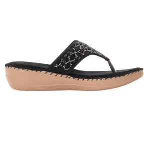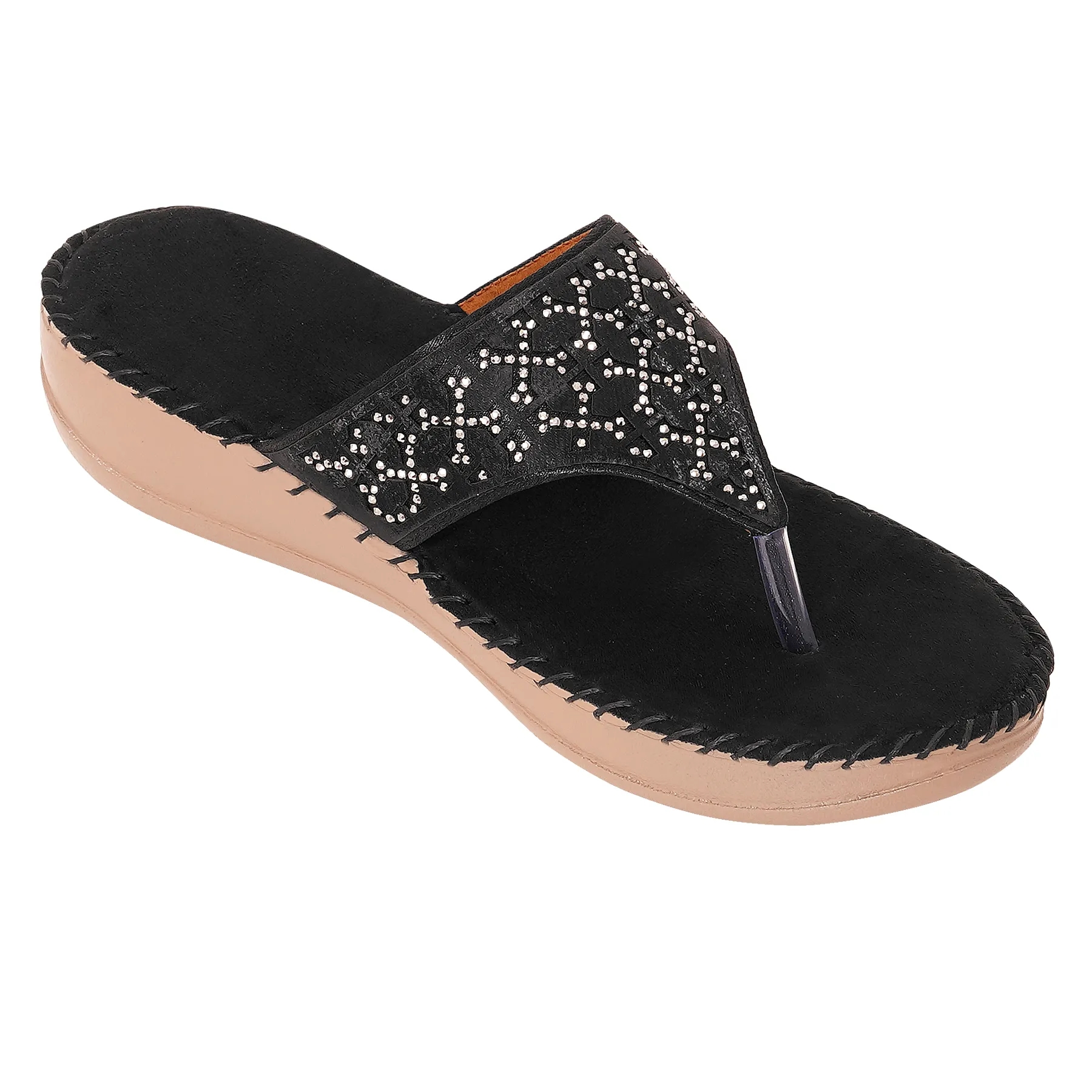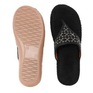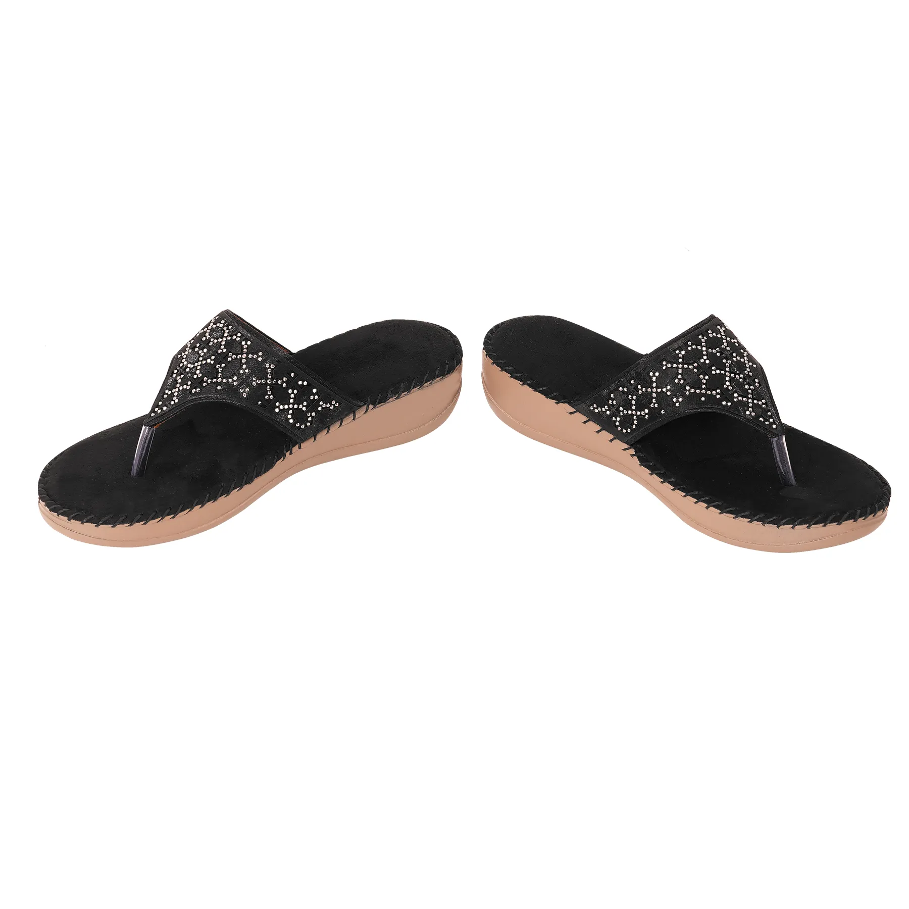 | Orthopaedic wedge flip flop in luxe black with intricate silver floral crystal pattern. Features premium velvet-touch footbed and ergonomic mid-sole for artistic elegance and therapeutic comfort. |